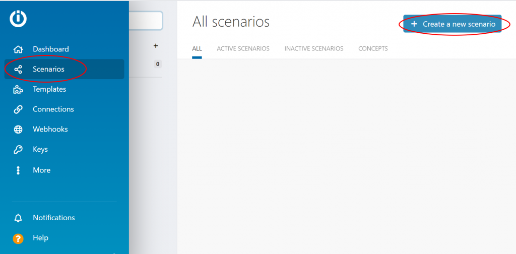 Una volta aperta la dashboard di Integromat andremo direttamente a creare il nostro scenario, questo può essere fatto cliccando sul link “Scenarios” nel menù di sinistra e poi su “Create a new scenario”, a questo punto verrà richiesto di scegliere le piattaforme che lo comporranno, questo è un passaggio che può essere fatto anche successivamente ma per comodità lo faremo subito.