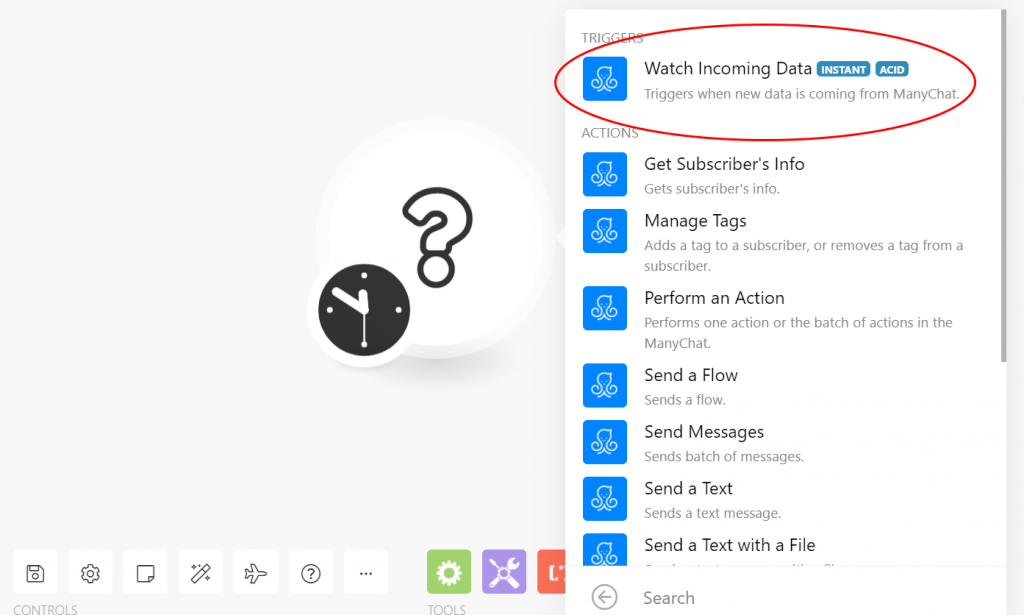 Adesso possiamo cliccare sul tasto “Continue” in alto a destra per iniziare a creare il blocco di ingresso. Scegliamo quindi Manychat dall’elenco e poi selezioniamo il “trigger” di ingresso che sarà “Wach Incoming Data”, questa operazione metterà il nostro scenario sempre in ascolto di dati provenienti da Manychat e attiverà all’interno di manychat una nuova Azione da inserire nei nostri flussi.