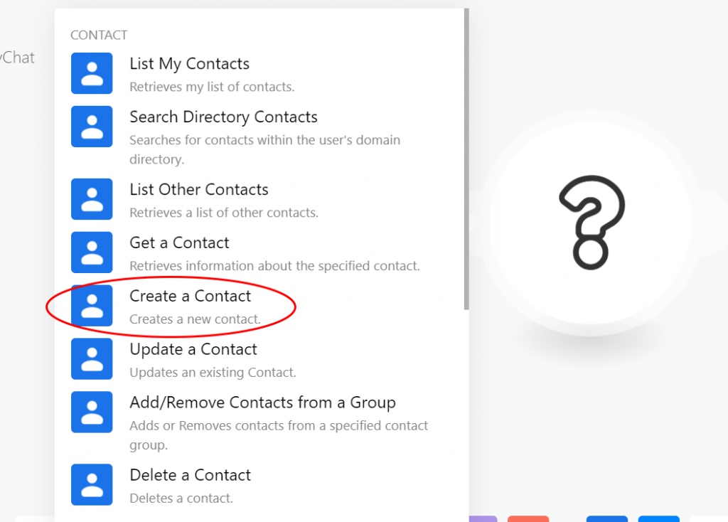 Lo scenario rappresenta una connessione tra piu piattaforme con un trasferimento e processamento dei dati da una all’altra. In questo caso andremo a creare uno scenario che ottiene dati in ingresso da ManyChat e li utilizza in uscita per creare contatti Google Contacts.