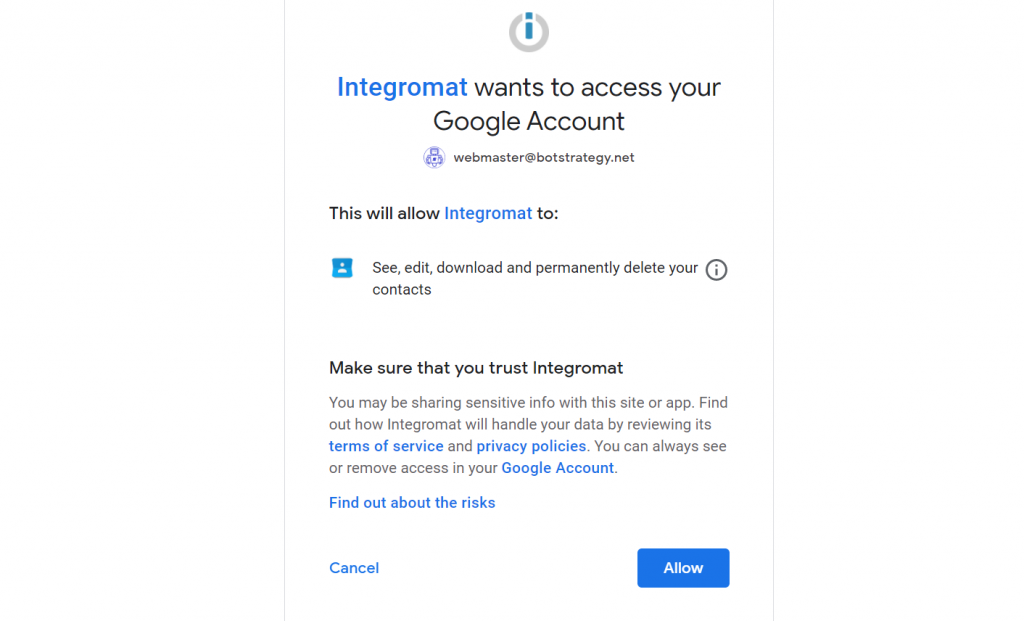 Come per Manychat ci verà richiesto di attivare una connessione tra Integromat e Google Contacts, per fare questo il processo è più semplice perché sarà sufficiente cliccare su ADD e ci verrà chiesto l’account da collegare e di consentire ad Integromat di utilizzare l’account per gestire i contatti