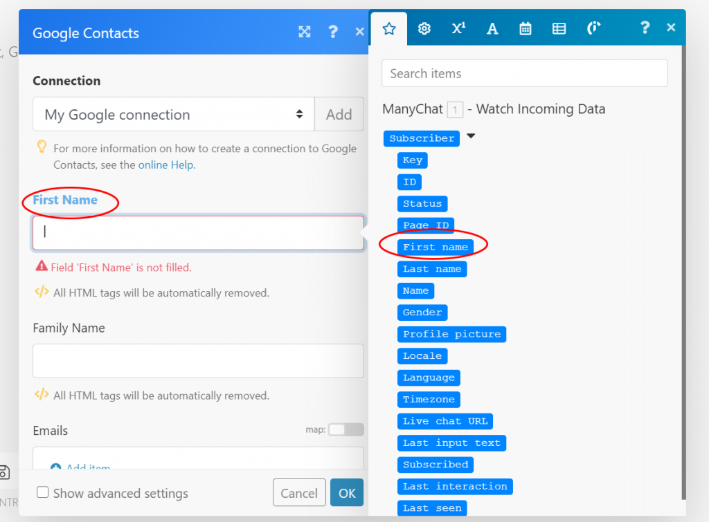 Il passo successivo sarà quello di “mappare” i dati che ci arrivano da ManyChat all’interno dei campi del contatto di Google, questo può essere fatto semplicemente selezionando i dati “blu” di Manychat nella lista ed assegnarli singolarmente ai campi contatto (ovviamente in questo caso il dati più importanti sono Nome e Telefono),  al termine salvare e, cosa molto importante, “attivare” lo scenario spostando l’interruttore su ON, quest’ultima operazione metterà lo scenario in ascolto per gli eventi provenienti da Manychat.