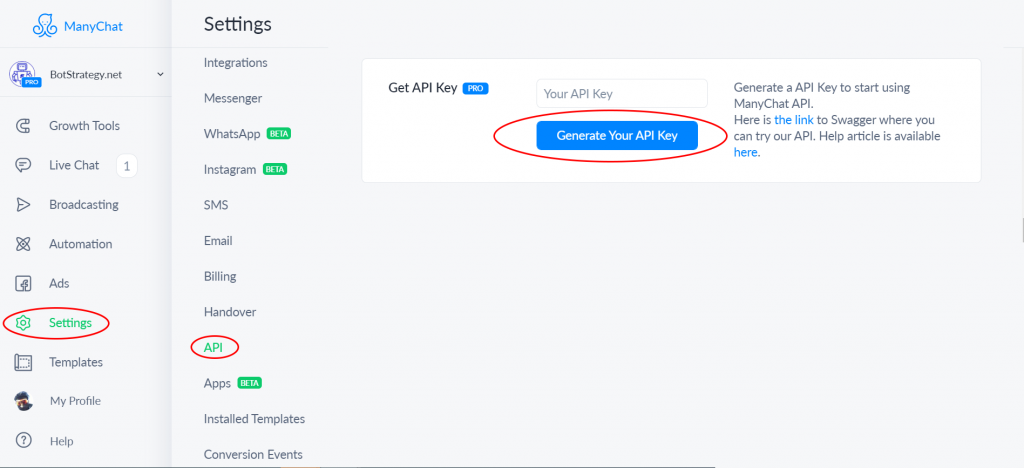 Per fare questo è necessario prima ottnere la chiave API di Manychat, questa è disponibile andando nel menù Settings e poi selezionare API, e se non è mai stato fatto cliccare sul tasto “Generate Your API Key” e copiarla per utilizzarla successivamente.